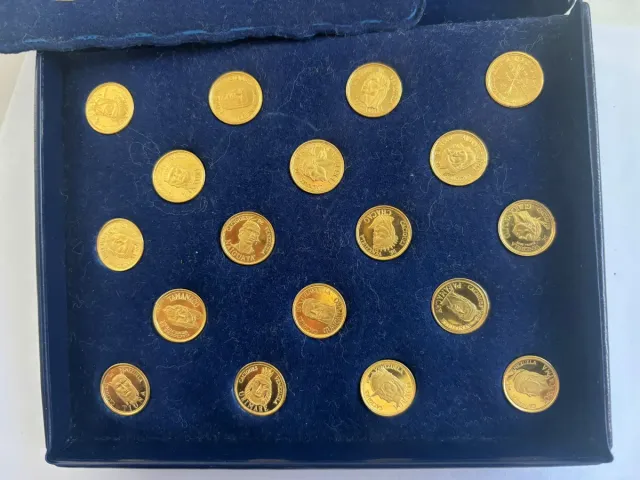 Detalles del productoConjunto de 18 medallas de oro conmemorativas de los Caciques de Venezuela. Cada medalla presenta un diseño detallado.