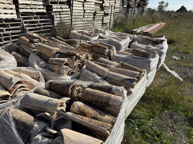 Se venden 18 palets de teja de barro antigua. Material de construcción tradicional. - Cantidad: 18 palets. - Tipo: Teja de barro. - Estilo: Antigua.