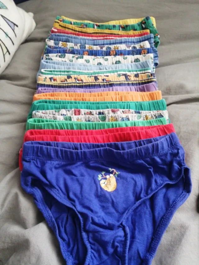 Detalles del productoLote de 19 slips para niños, tallas 122cm y 128cm 4,5años dependiendo del niño .23 cm cintura Diseños variados y coloridos.