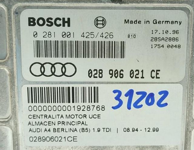 Referencia 028906021CE. AUDI A4 BERLINA (B5) Año 1995 1.9 TDI centralita motor uce. Observaciones 0281001425 426. Código interno 1928768.