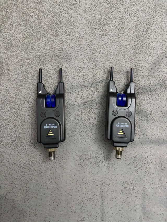 Se venden dos alarmas de pesca Ron Thompson B-Alert. - Color negro. - Rueda azul. - Indicador luminoso.