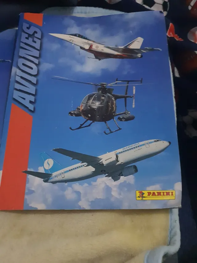 Álbum de cromos de aviones de la marca Panini. Ideal para coleccionistas. - Portada con diseño de aviones. - Incluye el logo de Panini.