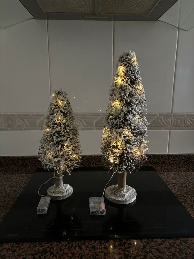 Detalles del productoConjunto de dos árboles decorativos para tu belén o pueblo navideño. Vienen con luces integradas para dar un toque mágico.