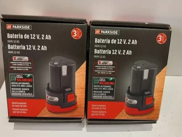 Detalles del productoVendo dos baterías nuevas a estrenar de la marca Parkside. Son de 12V y 2Ah. Ideales para herramientas. -Nuevas en su caja original. -Modelo PAPK 12 A3. -Sistema Cell Balancing para mayor autonomía. -Baterías de iones de litio.