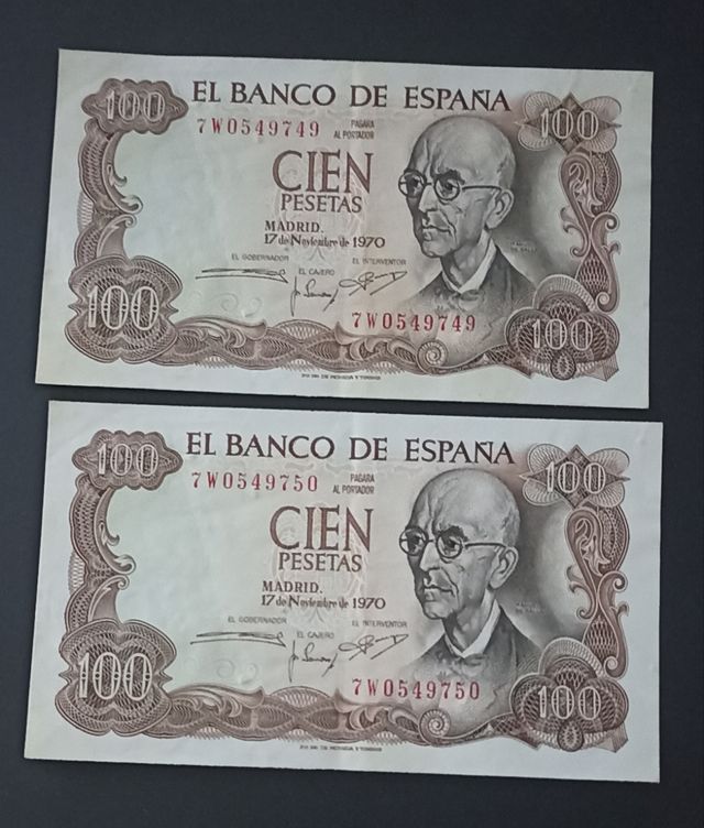 Detalles del productoSe venden dos billetes de 100 pesetas del Banco de España con fecha de 1970. Pareja correlativa de la serie 7W, última emitida.