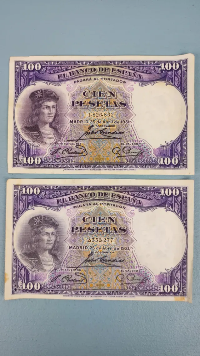 Detalles del productoSe venden dos billetes de 100 pesetas del Banco de España, emitidos en 1931.