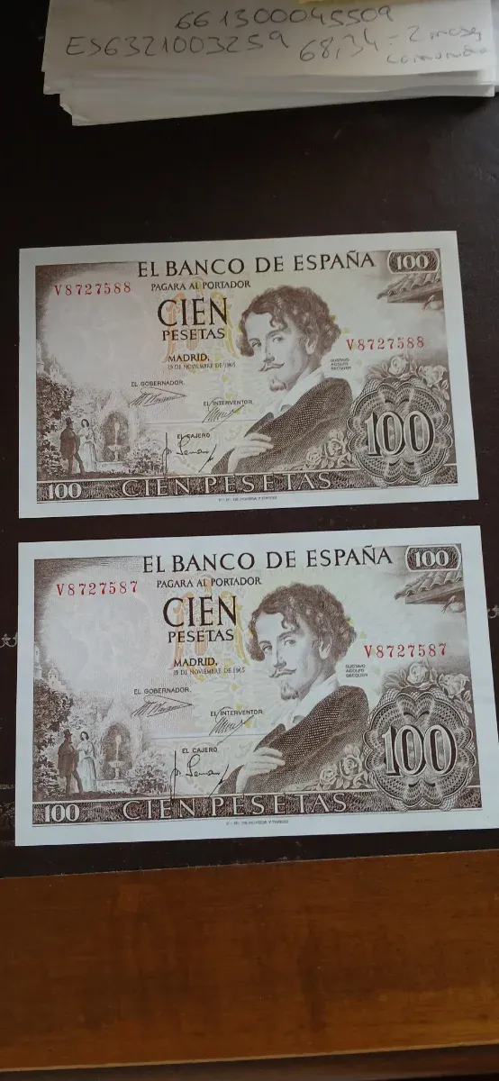 Detalles del productoPareja de billetes de 100 pesetas de El Banco de España de 1965, con la imagen de Gustavo Adolfo Bécquer. Son correlativos.