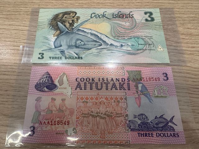 Detalles del productoDos billetes de 3 dólares de las Islas Cook. El billete superior muestra una escena con un tiburón y una figura humana, con el texto Cook Islands 3 THREE DOLLARS. El billete inferior, con fondo rosa, presenta COOK ISLANDS AITUTAKI y THREE DOLLARS, con imágenes de caracolas, mapas, personas bailando y peces.