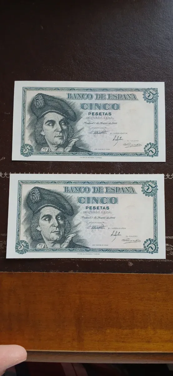 Detalles del productoPareja de billetes de 5 pesetas del Banco de España, con la imagen de Juan Sebastián Elcano. Son de la emisión de 1945 y presentan numeración correlativa.
