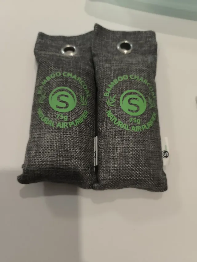 Dos bolsas purificadoras de aire hechas de carbón de bambú. - Cada bolsa contiene 75g de carbón de bambú. - Diseño con ojales para colgar.