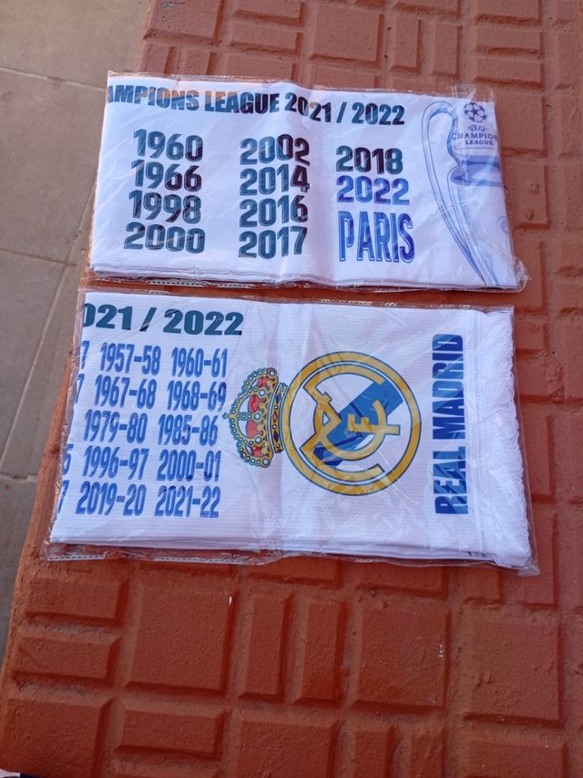 Detalles del productoDos bufandas conmemorativas de la Champions League 2021/2022. Una de ellas dedicada al Real Madrid.