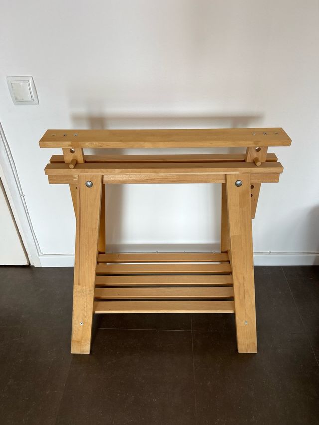 2 caballetes de madera, ideales para usar como soporte o mesa de trabajo. - Construcción robusta de madera. - Diseño plegable para fácil almacenamiento.
