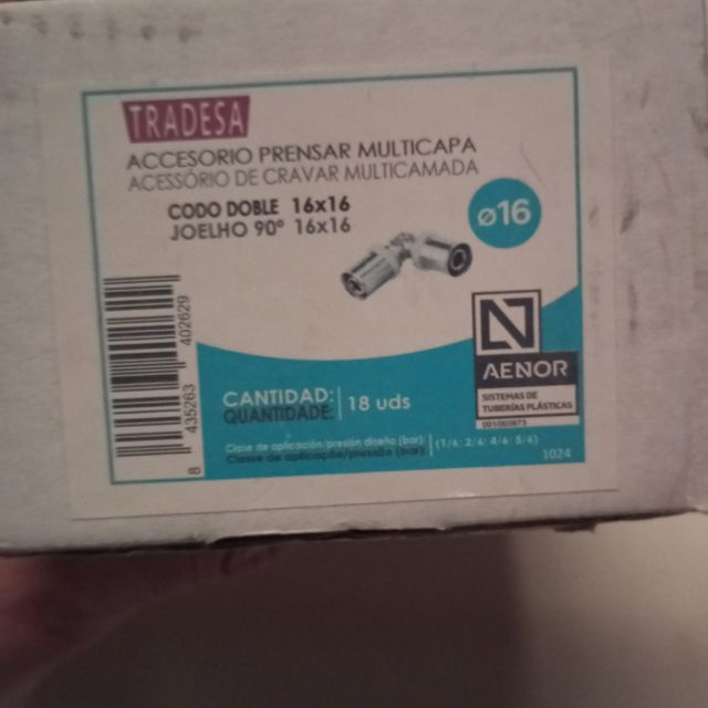 Detalles del productoSe venden 18 codos dobles de 90º para tuberías multicapa de 16mm. Son accesorios para presionar, nuevos y están en su caja original. - Codos de la marca Tradesa. - Medidas: 16x16 mm. - Tipo: Codo doble 90º. - Material: Multicapa. - Cantidad: 18 unidades.