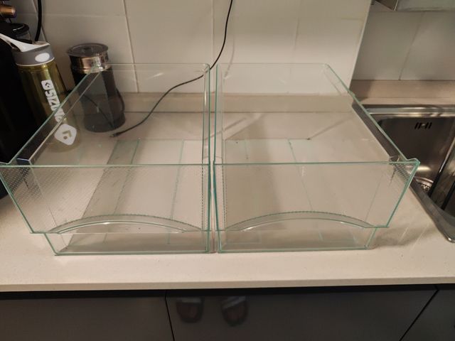 Detalles del productoDos cajones transparentes para nevera Liebherr. Ideales para organizar frutas y verduras. Se encuentran en buen estado, sin apenas señales de uso.