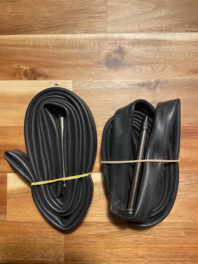 Detalles del productoDos cámaras de aire para bicicleta de carretera, con válvula larga de 80 mm. Se encuentran en buen estado.