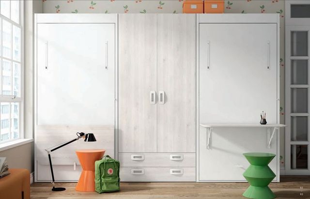 Detalles del productoComposición de 2 camas abatibles verticales con escritorios incorporados y armario,medida de ancho total 315 cms.Diferentes opciones de color a elegir,camas para colchones de 90×190 no incluídos