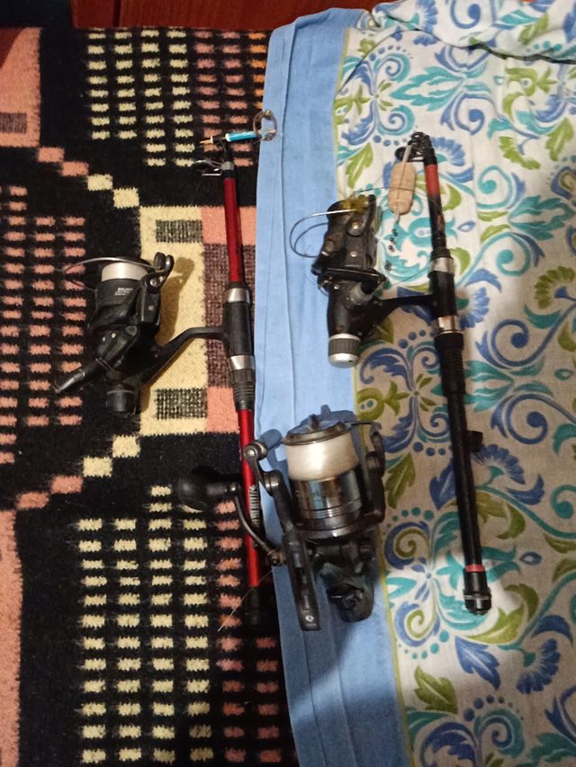 Se venden dos cañas de pescar, cada una con su carrete. Incluye un carrete adicional. - Cañas de pescar con carretes. - Un carrete extra.