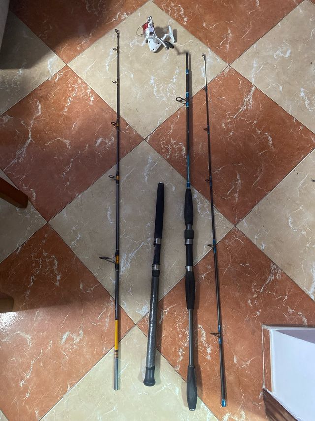 Detalles del productoSe venden dos cañas de pescar junto con un carrete.