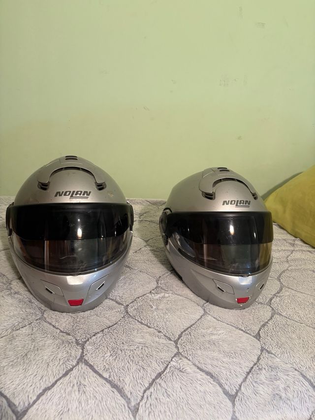 Se venden dos cascos de moto de la marca Nolan en color plateado. Son cascos integrales con visera desmontable.