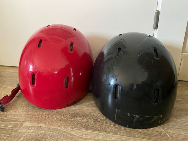 Dos cascos de esquí en buen estado. Uno rojo y otro negro. Ideales para protegerte en la nieve. - Perfectos para esquiar. - Diseño clásico. - Colores: rojo y negro.