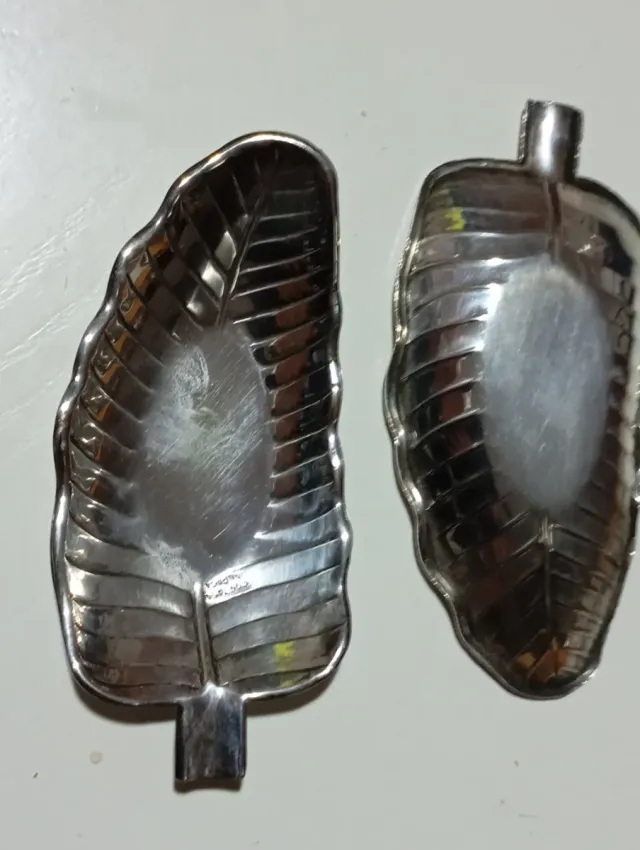 Set de dos ceniceros con forma de hoja, fabricados en alpaca. - Diseño detallado de hoja. - Material: Alpaca.