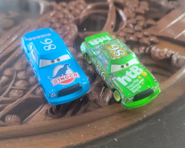 Detalles del productoDos coches de juguete del personaje Dinoco con el número 86.