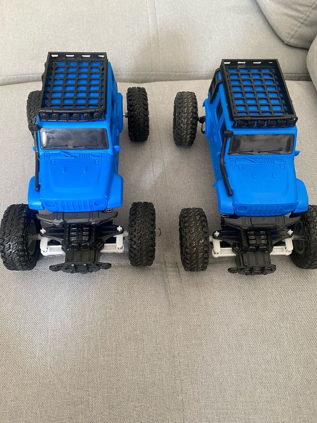 Detalles del productoSe venden dos coches de radio control, tipo Jeep, de color azul. Son réplicas a escala de todoterreno, con neumáticos grandes y resistentes. Incluyen una baca en la parte superior. Ideales para jugar al aire libre.