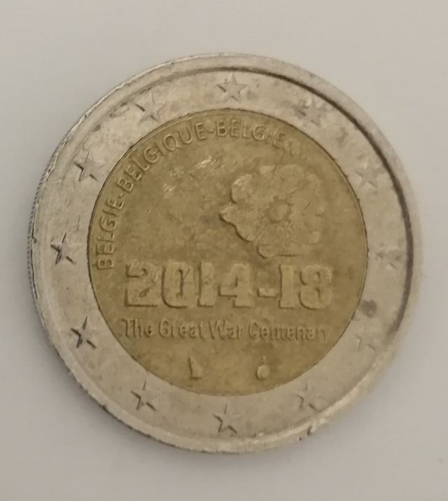 2 € conmemorativa Bélgica 2014, 100 años del comienzo de la primera guerra mundial. Circulada. En estado aceptable.