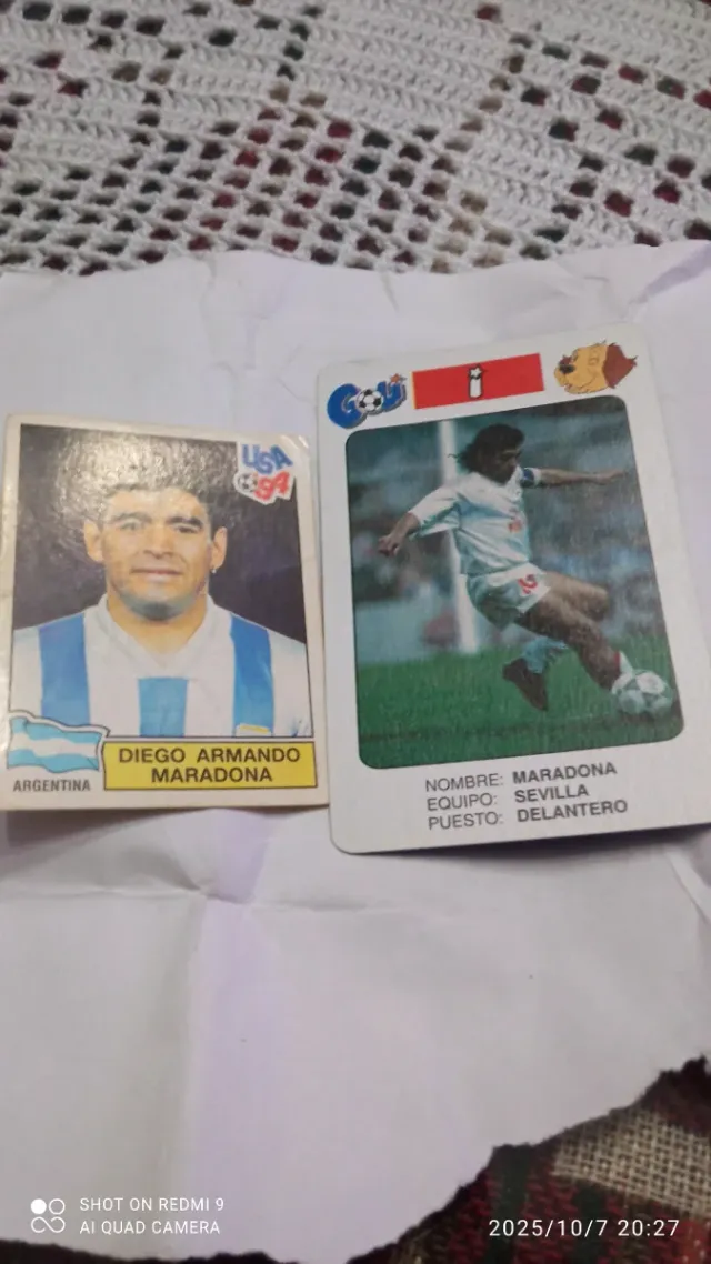 Dos cromos de Diego Armando Maradona. - Uno de la colección USA 94. - Otro de la baraja 92/93, del equipo Sevilla, puesto delantero