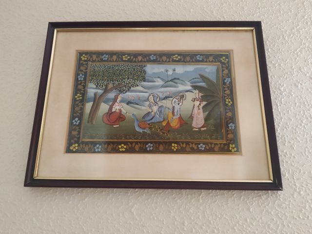 Conjunto de 2 láminas en seda enmarcadas con motivos hindúes.Medidas 41x31 y 30x39 - Marco de madera. - Impresión sobre seda
