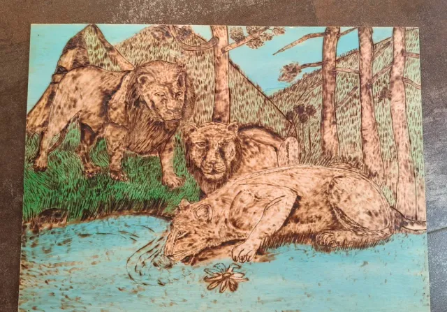 Detalles del productoConjunto de dos cuadros decorativos realizados con la técnica de pirograbado sobre madera. La escena representa leones en un entorno natural.