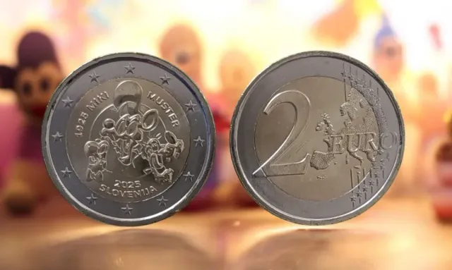 Moneda conmemorativa de 2 euros de Eslovenia del año 2025. Diseño especial con Miki Muster. Bimetálica, con borde plateado y centro dorado. Sin circular. Precio: 5€