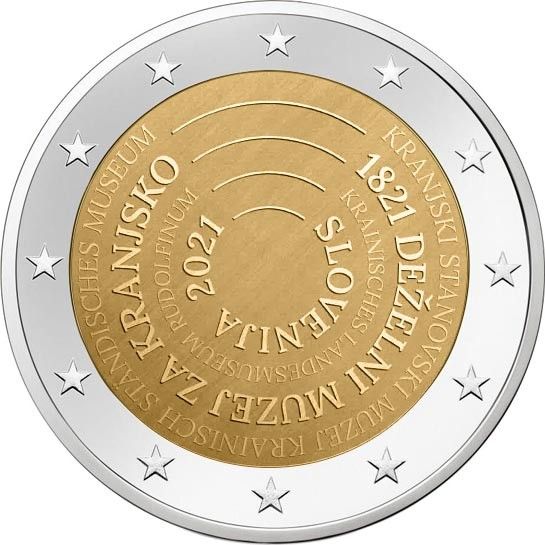 Moneda conmemorativa de 2 euros de Eslovenia del año 2021. - Diseño del Museo de Kranj. - Canto estrellado.