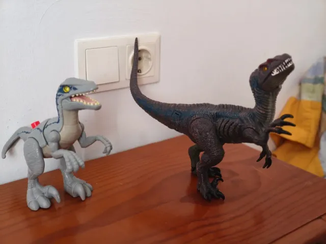 - Figura de dinosaurio azul oscuro con detalles en negro y ojos rojos y con sonido