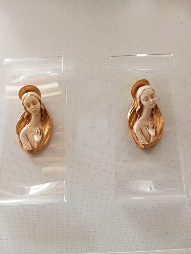Detalles del productoConjunto de dos figuras antiguas de la Virgen Niña. Cada figura está enmarcada en un contorno dorado y presenta un halo.