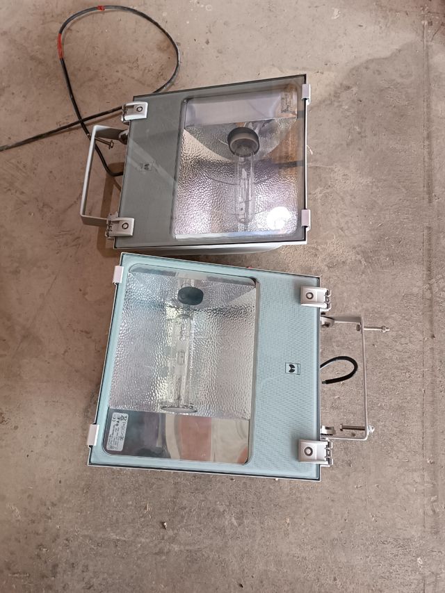 Detalles del productoFoco IP65, de 250W, con bombilla de halogenuro, casi sin usar, solo hay que ver las imágenes, varias unidades. Es el ideal para pistas de padel o deportes exterior, patios, naves, etc. éste es el precio de dos focos Medidas del producto