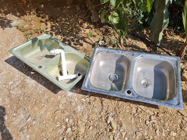 Detalles del productoDos fregaderos en buen estado. Uno de acero inoxidable y otro de resina, ambos de dos senos. Se venden juntos. - Fregadero doble de acero inoxidable. - Fregadero doble de resina color verde. - Incluye sifones de PVC.