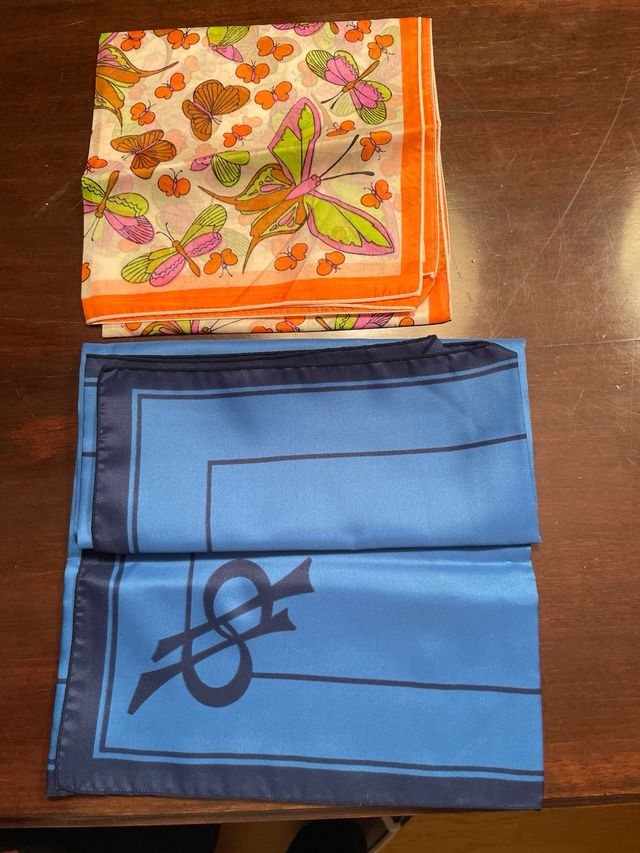 El fular azul es de poliéster el de las mariposas no lo pone, pero parece de seda natural por el tacto que tiene. Vendo los dos por 15 €.