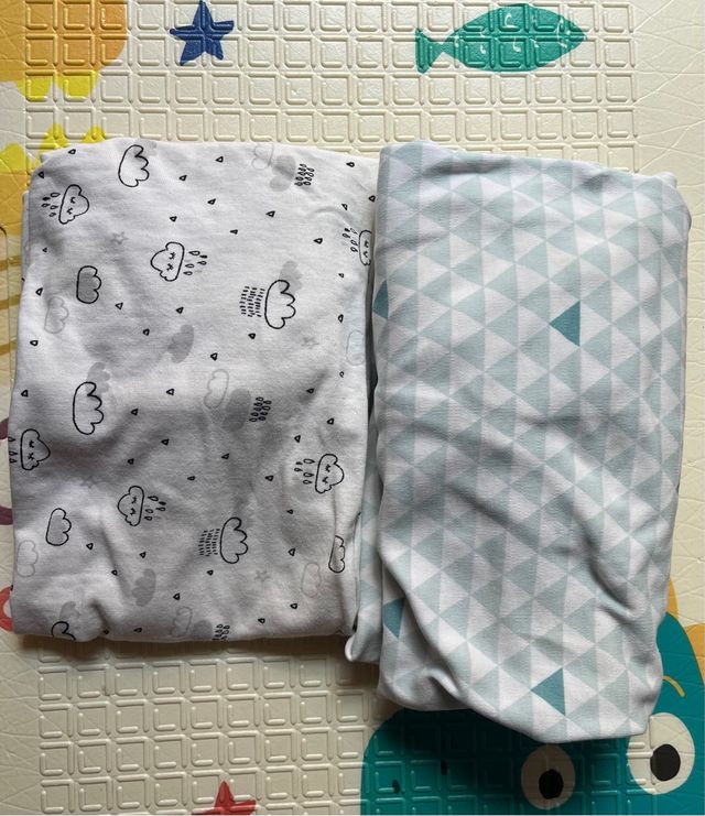Dos fundas para cambiador de bebé de la marca Luma. Son suaves y cómodas. - Diseño de nubes y gotas de lluvia. - Estampado geométrico en tonos verdes y blancos.