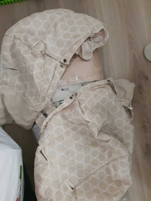 Dos fundas para silla de paseo Bugaboo con un bonito estampado de círculos. Diseño en tonos beige y blanco.