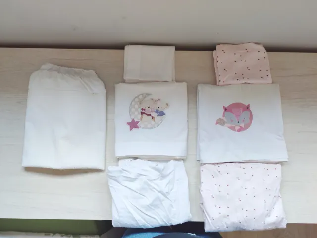 100% algodón. Super suaves. Hechas en España. Cada juego incluye bajera+encimera+funda almohada. En la compra se regala el cubre colchón de cuna también NUEVO.