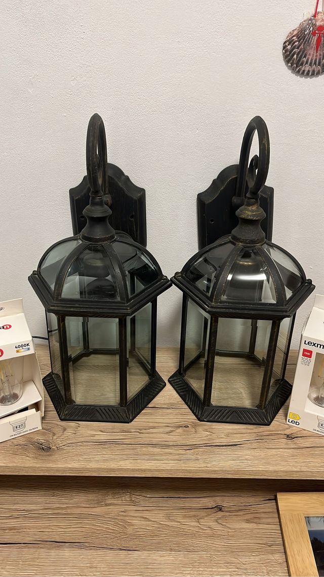Detalles del productoConjunto de dos lámparas de pared para exterior con un diseño clásico y elegante. Perfectas para iluminar entradas o terrazas.