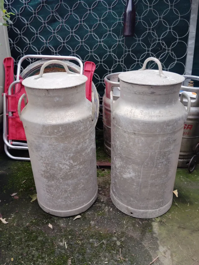 Conjunto de dos lecheras metálicas antiguas, perfectas para decoración. - Material: Metal. - Diseño clásico de lechera.