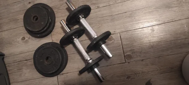 Par de mancuernas con discos de peso. - Cada mancuerna pesa ,2kg - Discos de hierro fundido 16kg