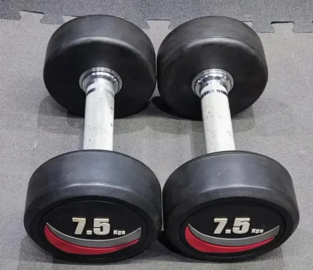 Detalles del productoPar de mancuernas de 7.5 kg cada una, son de metal cubierto de goma.