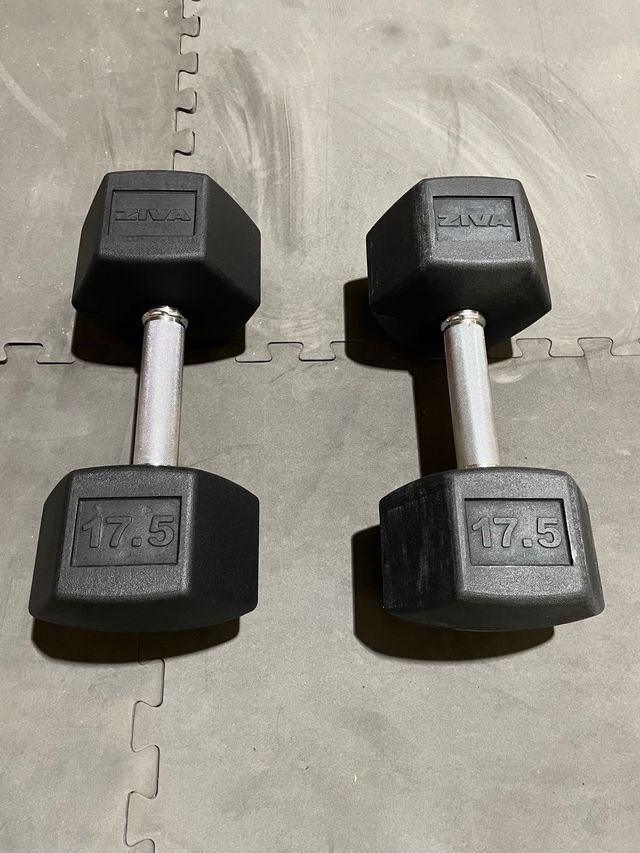 Detalles del producto2 mancuernas hexagonales de 17,5kg cada una recubiertas de caucho, a estrenar