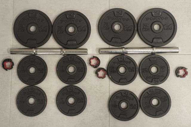 Cada mancuerna tiene, una barra de mancuernas con cierre (2 kg), 2 pesas de 2 kilos y 4 pesas de 1 kilo. Recoger en Vicalvaro o Coslada.