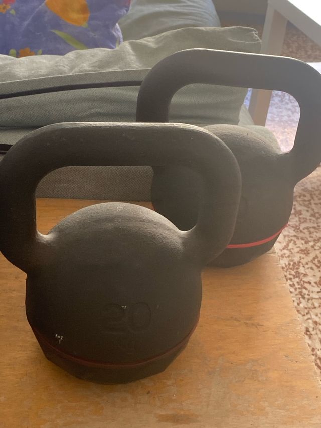 Detalles del productoSe venden dos mancuernas tipo kettlebell de 20 kg cada una. Ideales para entrenamientos de fuerza y acondicionamiento físico.