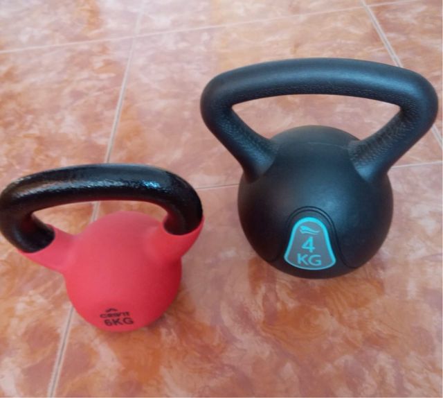 Detalles del productoSe venden dos kettlebells, una de 6kg y otra de 4kg. Ideales para entrenamientos de fuerza y acondicionamiento físico.