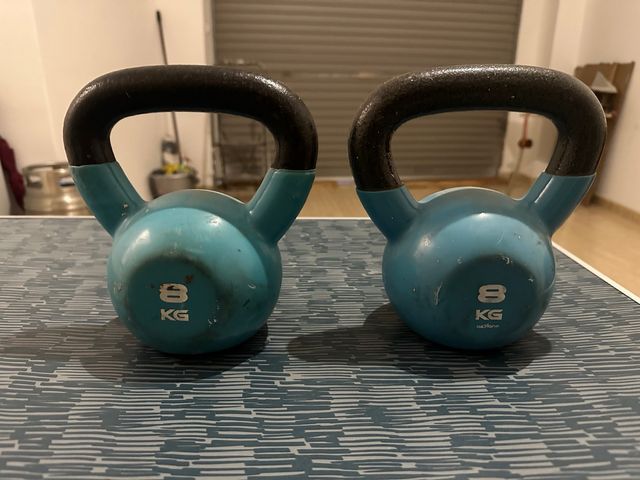 Detalles del productoPar de mancuernas kettlebell de 8 kg cada una. Ideales para entrenamientos de fuerza y acondicionamiento.